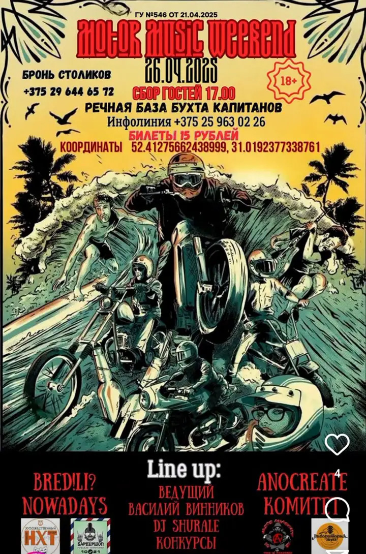 Любителей мотоциклов приглашают на Motor music weekend в Бухту капитанов. Такое событие бывает только раз в году, пишут организаторы, не пропустите его. Ведущий программы Василий Винников. Подробности по телефону инфолинии +375 25 963-02-26.
