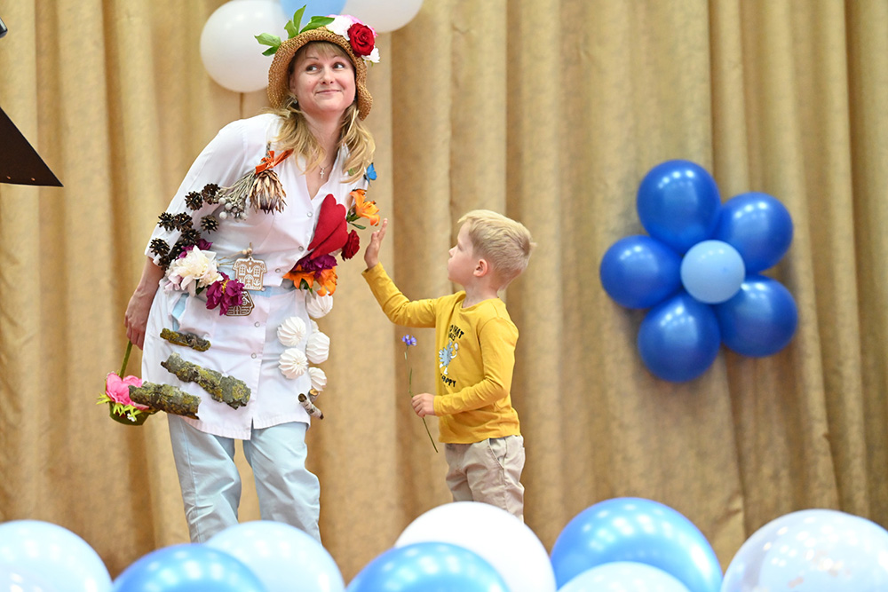 Найти подход к детям медработнику непросто. Малыши могут испугаться незнакомого места, людей в белых халатах и тем более – укола. Проблему решила команда, которая представила тактильный костюм медсестры педиатрического отделения. Главный плюс костюма – яркие и экологичные аксессуары. Пока маленький пациент Матвей активно изучал увешанный ими халат, взрослые успели обсудить назначенное лечение.