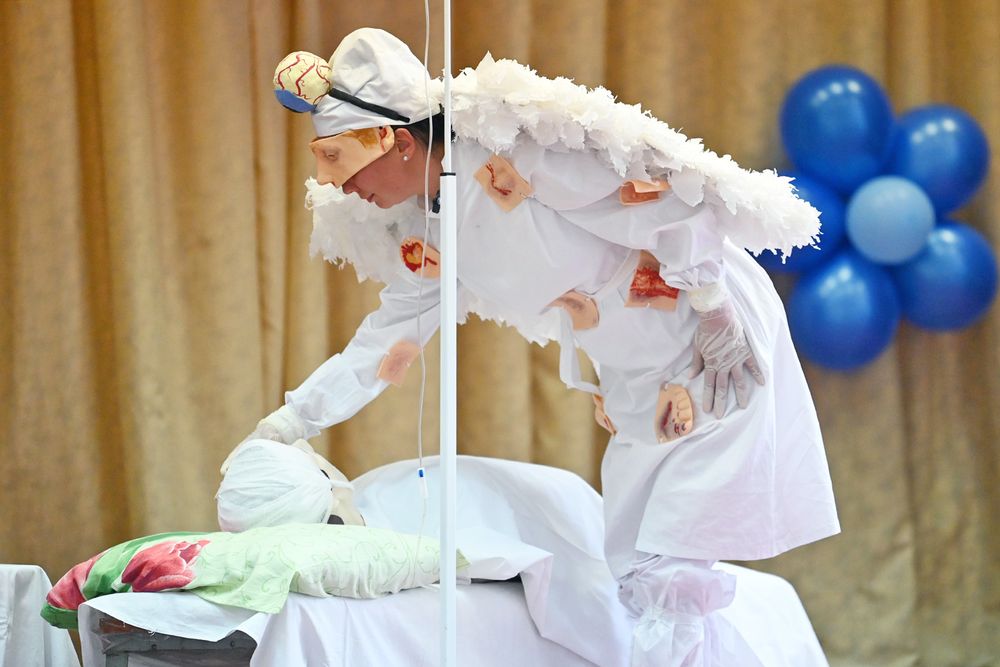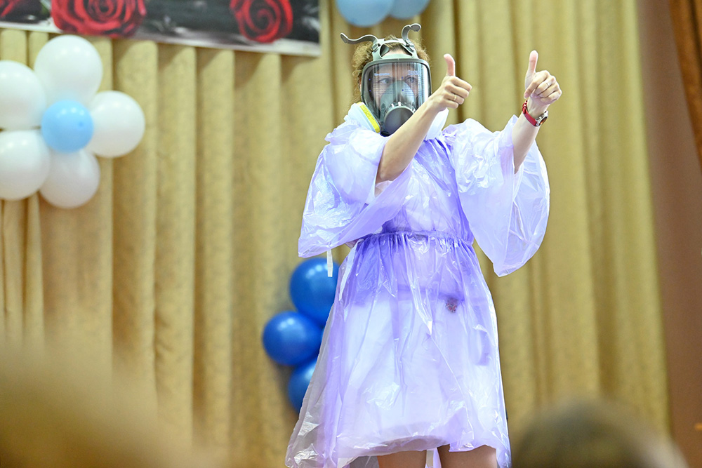 Одна из команд акцент в костюме сделала на полной защите медработника от биологических и химических угроз. Снизить риск инфекционных заболеваний, связанных с оказанием медпомощи, помогут перчатки с содержанием серебра. Их действие на сцене продемонстрировала преподаватель хирургии, травматологии и ортопедии Сабила Ковалёва.
