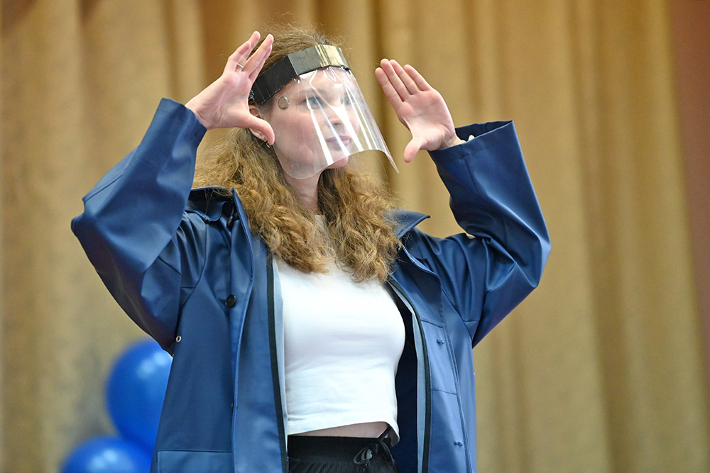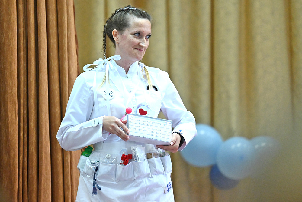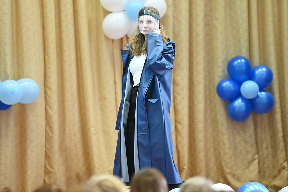 Одна из команд акцент в костюме сделала на полной защите медработника от биологических и химических угроз. Снизить риск инфекционных заболеваний, связанных с оказанием медпомощи, помогут перчатки с содержанием серебра. Их действие на сцене продемонстрировала преподаватель хирургии, травматологии и ортопедии Сабила Ковалёва.