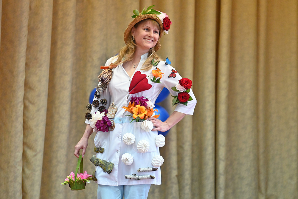 − Каждая медсестра проходит, а то и пробегает за день большие расстояния. С крыльями будет быстрее, − поделилась мыслями преподаватель дисциплины «Сестринское дело и манипуляционная техника» Татьяна Шведова и обратила внимание на другие яркие детали своего образа: − Раны пациентов, изображённые на халате, символизируют то, что медсёстры облегчают боль людей. А на голове у меня всевидящее око, которое следит за каждым пациентом: пропустить приём лекарств не получится!