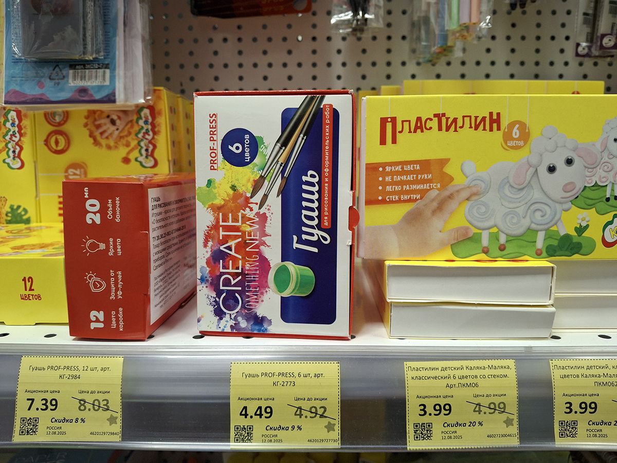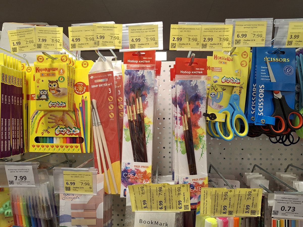 Особое внимание уделили канцелярским товарам. Письменные принадлежности и товары для творчества можно приобрести по выгодным ценам. Школьные тетради на 12 листов доступны от 0,19 руб., общие и полуобщие тетради — от 0,97 руб. Для творческих занятий — альбомы для рисования от 2,99 рублей и цветная бумага с картоном от 0,99. Наборы обложек для тетрадей из 10 штук можно приобрести за 2,99 руб. В ассортименте представлены также фломастеры, карандаши, пластилин, ножницы, ручки и линейки по сниженным ценам.