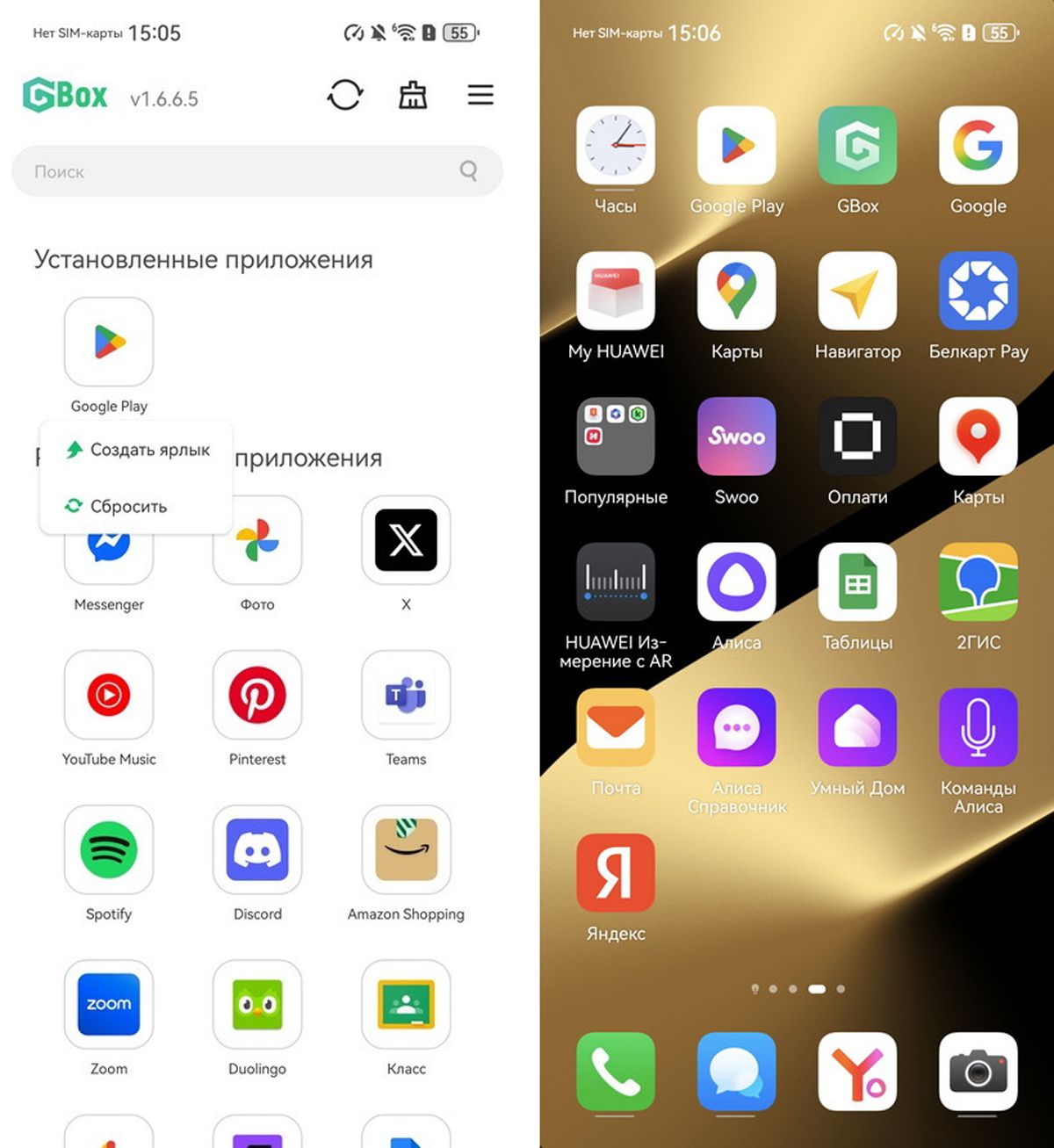 На Huawei Pura 80 Pro и других смартфонах Huawei под управлением фирменной оболочки EMUI 14 и выше GBox («ДжиБокс») работает немного по-другому. Если внутри уже есть microG («микроДжи»), то приложения через Gbox («ДжиБокс») устанавливаются прямо в память устройства. Это позволяет им в дальнейшем быстро и без дополнительных затрат энергии запускаться. А microG («микроДжи») обеспечивает их полноценную функциональность.