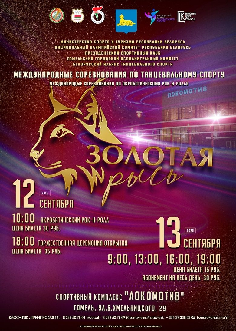 От медленного вальса до румбы и джайва – паркет в спорткомплексе “Локомотив” 12 и 13 сентября будет плавится под ногами лучших танцоров Беларуси и России. Здесь пройдет традиционный турнир по танцевальному спорту “Золотая рысь”.