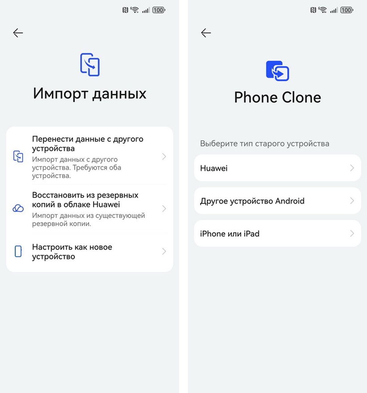 Если ранее вы пользовались смартфоном Huawei, то переносить данные с предыдущего устройства советуем с помощью приложения Phone Clone. Причем оно работает не только с устройствами Huawei, но и со смартфонами других брендов на Android или iOS. Можете также подтянуть данные из облака Huawei или просто настройте смартфон как новое устройство.