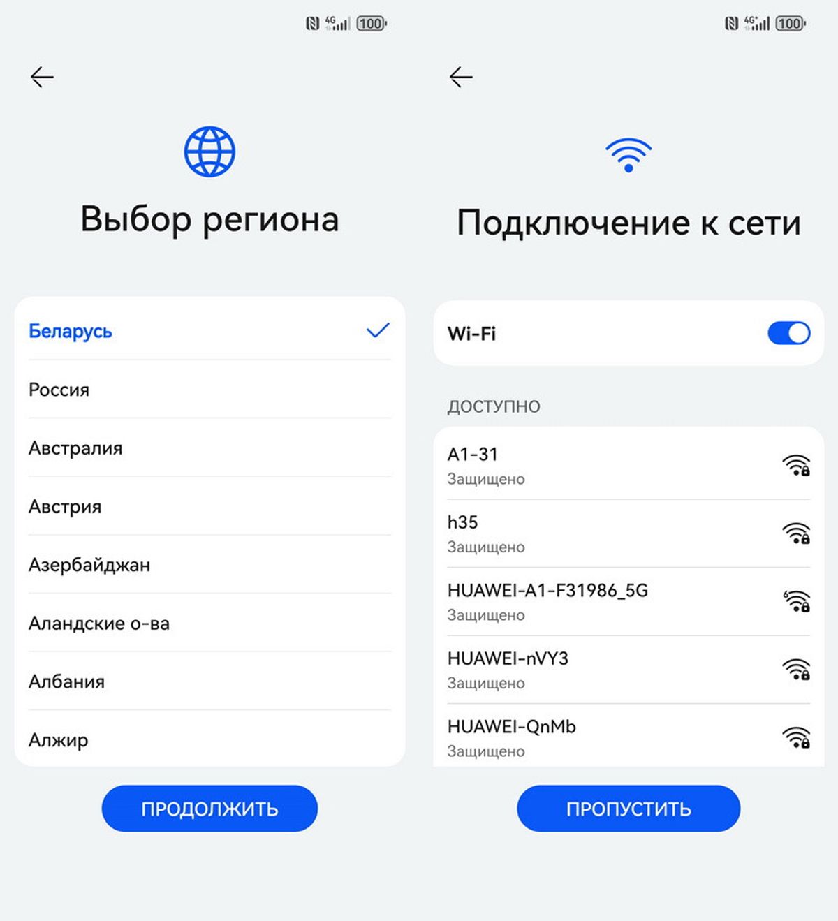 Для включения зажмите боковую кнопку питания. После загрузки первым делом, выберите язык и регион. Белорусский и русский языки присутствуют по умолчанию. Укажите регион «Беларусь» для корректного отображения даты и доступности приложений. Затем примите лицензионное соглашение. Без этого шага продолжить настройку невозможно. Ставим соответствующую галочку и жмем «Далее».