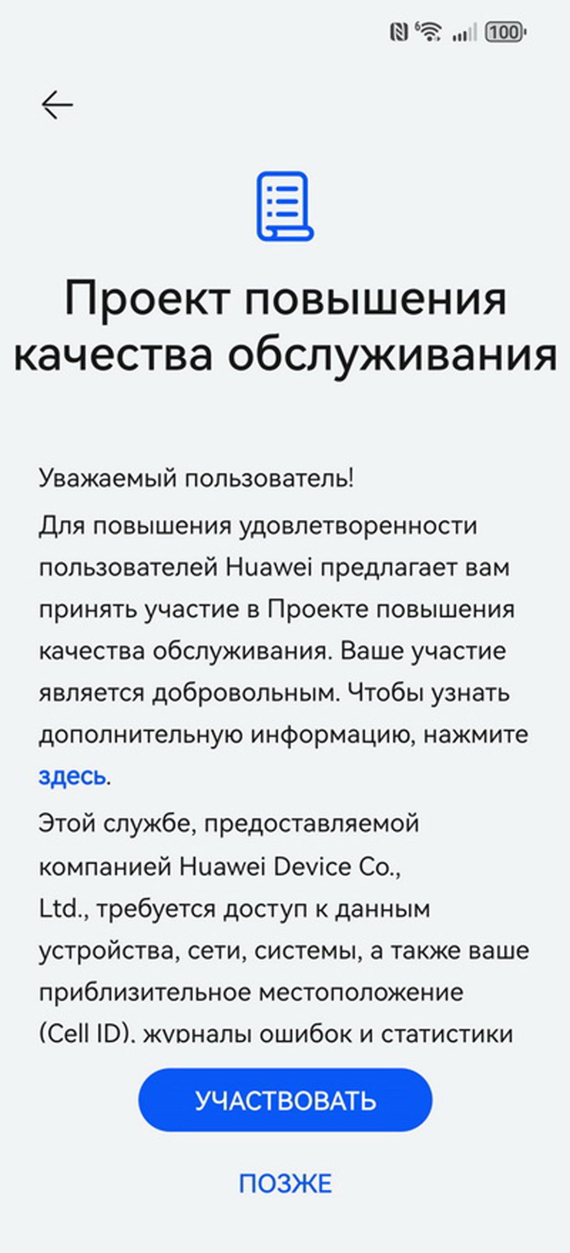 Рекомендуем не отказываться от участия в проекте повышения качества обслуживания. Это опция добровольная, но полезная: позволяет собирать данные о различных ошибках в программном обеспечении и помогает оптимизировать устройства.