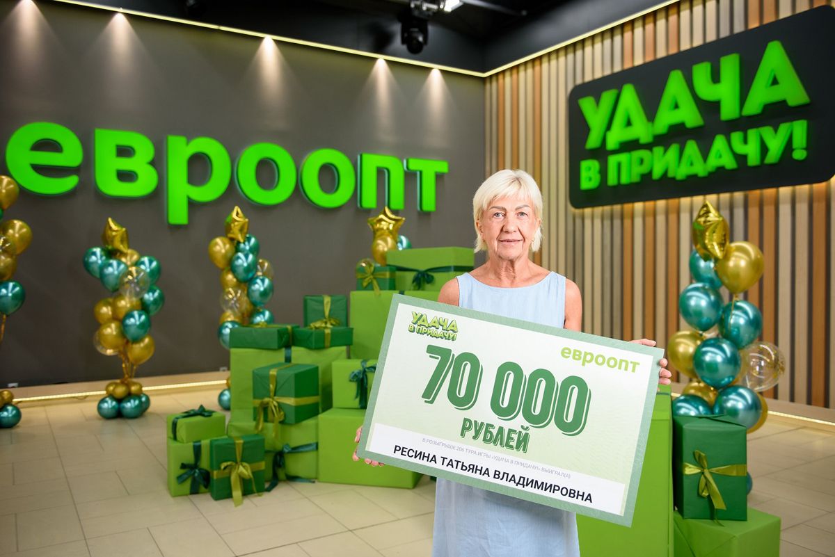 В начале сентября гомельская пенсионерка Татьяна Ресина неожиданно выиграла суперприз – 70 000 рублей в 206-м туре игры «Удача в придачу!». Этот счастливый момент стал поводом для настоящего праздника – торжественное вручение прошло 11 сентября в Минске, а сама Татьяна с волнением вспоминает каждый миг этой удивительной истории. Всё началось с обычной покупки в «Евроопте».
