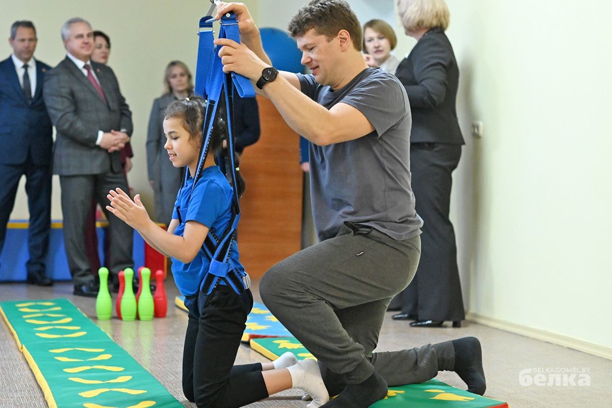 «Те, кто не могут удерживать себя вертикально из-за диагноза, на тренажере получают этот опыт», – объяснил сын изобретателя Артур, он приехал в Гомель, чтобы установить тренажер и проинструктировать местных педагогов.