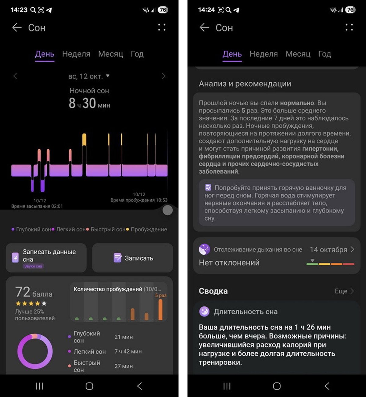 Особенно детально проработан анализ сна. Устройство не просто фиксирует его продолжительность, но и предоставляет детальный отчет, показывая, сколько раз вы просыпались ночью и как долго длилась самая важная фаза – глубокого сна.