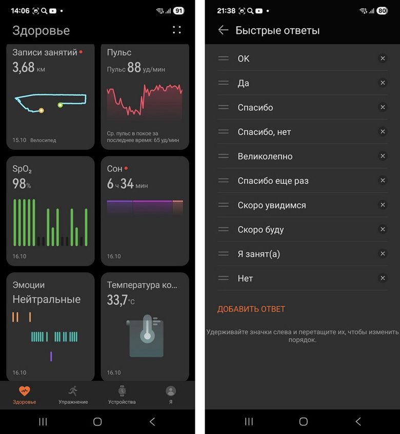 Данные отслеживания параметров организма стекаются во вкладку «Здоровье». Пульс, содержание кислорода в крови, качество сна, эмоции – все это отображается в виде графиков. Расположение панелей и их количество можно настроить по своему усмотрению через кнопку «Изменить».