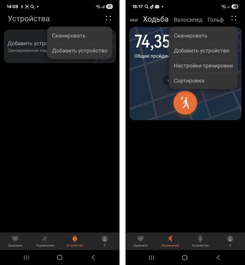 Процедура подключения – простая. Когда все подготовительные работы сделаны, включите Bluetooth на смартфоне и сами часы. Далее зайдите в приложение «Здоровье» и нажмите на иконку в виде четырех точек. Она расположена вверху справа. Можно сделать это и через вкладку «Устройства», но необязательно. Просто в этом случае в выпадающем меню будет меньше лишних для нас сейчас пунктов.
