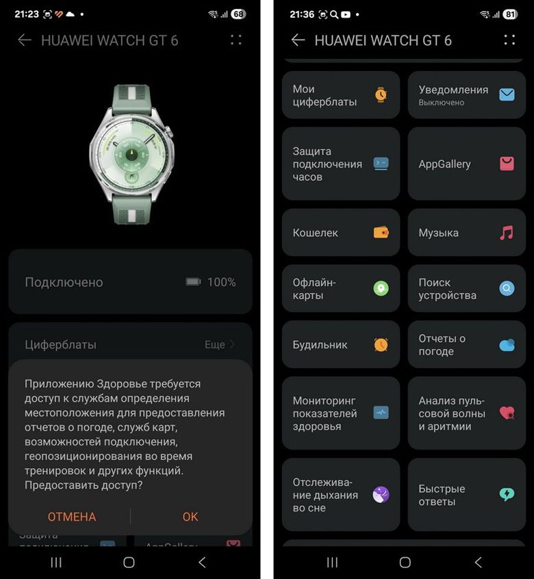 Уже в процессе сопряжения устройство Huawei попросит дать разные разрешения и принять условия использования. В нашем случае часы предложили разрешить работу с вызовами и СМС, а также предоставить доступ к списку контактов и геоданным. Можно дать на это добро сразу, можно – чуть позже в настройках. Надо понимать, что без сответствующих разрешений некоторые функции работать не будут.