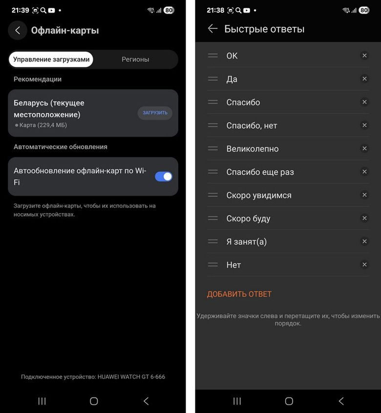 Список опций доступен большой, Поэтому перечислим лишь некоторые из них. Функция «Кошелек» позволяет привязать к часам банковскую карту для бесконтактной оплаты. «Офлайн-карты» дают возможность скачивать на часы карты местности, чтобы ими можно было пользоваться без смартфона под рукой. А в «Быстрых ответах» можно настраивать собственно быстрые ответы с экрана устройства на входящие сообщения в мессенджерах или СМС.