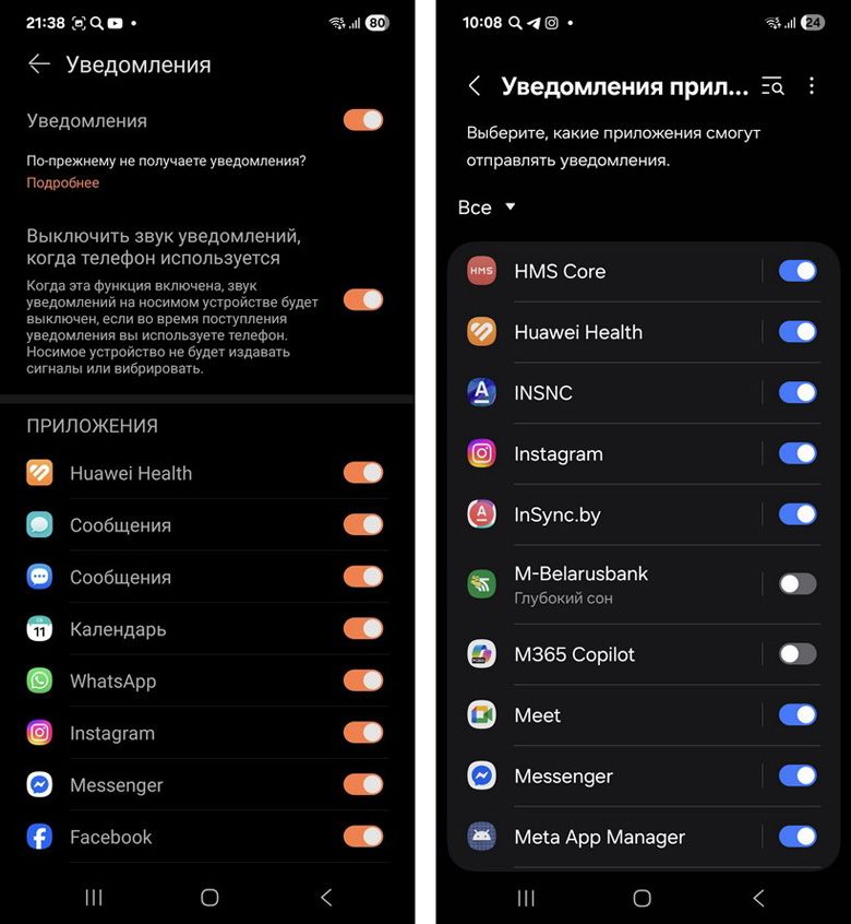 В «Уведомлениях» можно настроить, какие именно приложения будут присылать уведомления. Или совсем отключить эту функцию. Кстати, не забудьте дать соответствующее разрешение в настройках самого смартфона для приложения Huawei Health («Здоровье»), иначе уведомления приходить не будут.