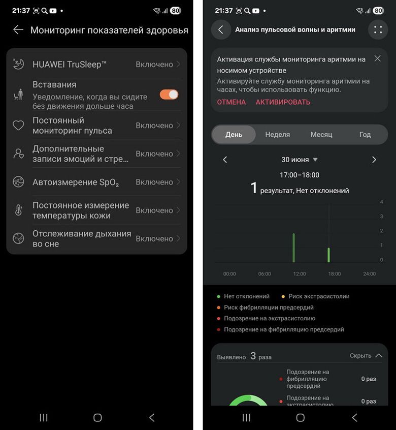 Вкладка «Мониторинг показателей здоровья[2]» позволяет включать и отключать отслеживание большинства параметров организма. По умолчанию они почти все активированы. Но здесь собраны далеко не все опции. Так, функции анализа пульсовой волны и аритмии, а также отслеживания дыхания во сне нужно включать отдельно в соответствующих одноименных окошках. Далее нужно дать согласие для каждой такой функции уже непосредственно на часах.