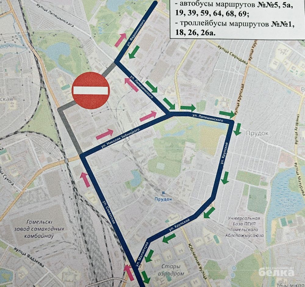Общественный транспорт тоже пустят в объезд. Автобусы №№5, 5а, 19, 39, 59, 64, 68, 69, а также маршрутные такси №№3-ТК и 25-ТК и троллейбусы №№1, 18, 26 и 26а в направлении микрорайона «Новая Жизнь» пойдут по улицам Зебницкого и Лепешинского. А в направлении улицы Советской – по Лепешинского, Крупской, Малайчука.