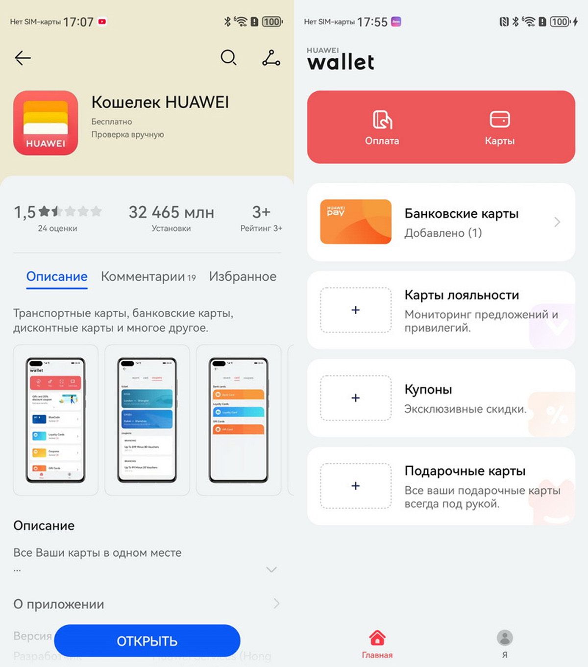 На смартфонах Huawei сервис Huawei Pay работает через приложение «Кошелек Huawei», где оно уже установлено. Достаточно лишь обновить его через Huawei AppGallery, чтобы подключиться.