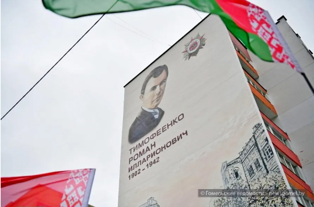 Мурал на улице Советской изображает гомельского подпольщика Романа Тимофеенко, посмертно награждённого орденом Отечественной войны I степени.