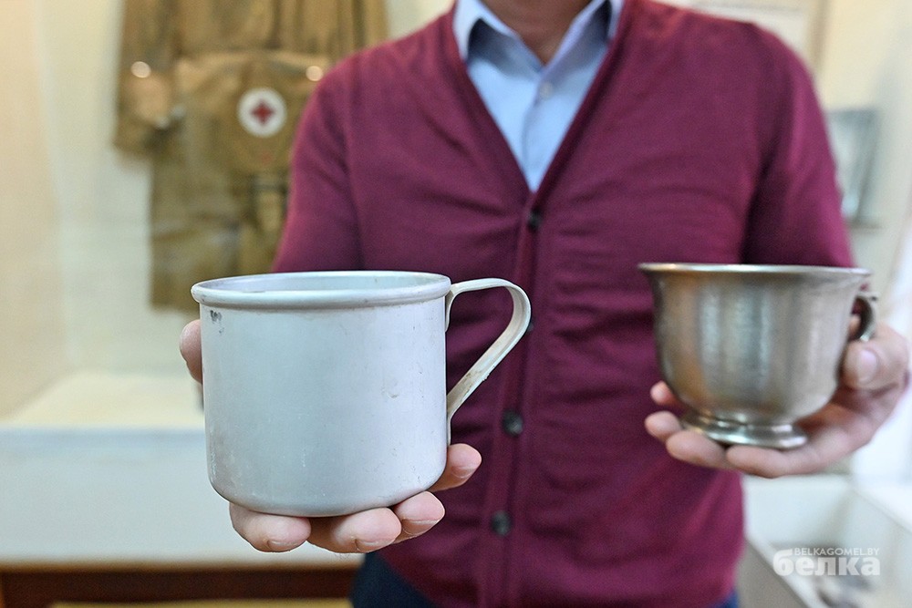 Среди других экспонатов — две походные кружки. Наша — алюминиевая и немецкая — стальная, внутри отделанная фарфором.