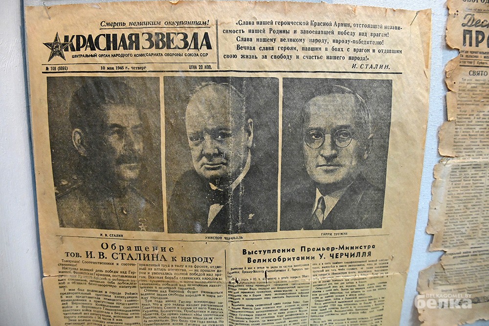 Или номер «Красной звезды» от 10 мая 1945 года, где напечатаны обращения Сталина, Трумэна и Черчилля к советскому народу как к народу победителю. Из них понятно: в то время ни у кого не было сомнений, что именно советский народ внёс решающий вклад в разгром гитлеровской Германии и спас весь мир от «коричневой чумы».