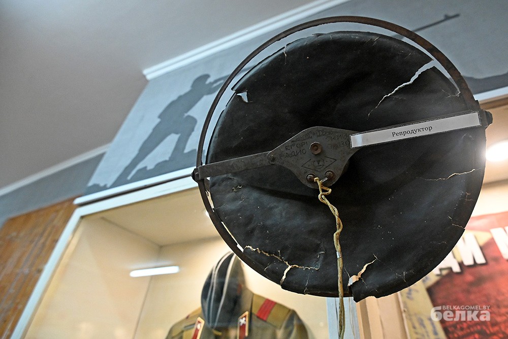 Над патефоном расположена тарелка-репродуктор производства Егорьевского радиозавода. Год выпуска — 1934-й. Именно такие висели до войны во многих сельских домах, именно по таким «тарелкам» советские люди узнали и о начале войны с фашисткой Германией, и о победе над ней. Сегодня репродуктор не передаёт радиопередач, но, глядя на него, словно слышишь голос Левитана, голос эпохи.