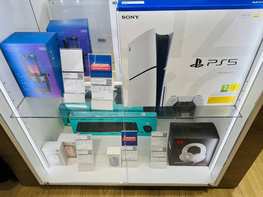 На соседних витринах выставлены ноутбуки, студийные микрофоны, планшеты, клавиатуры, наушники, мыши, Яндекс-станции. Своего покупателя, например, ждет и игровая консоль.