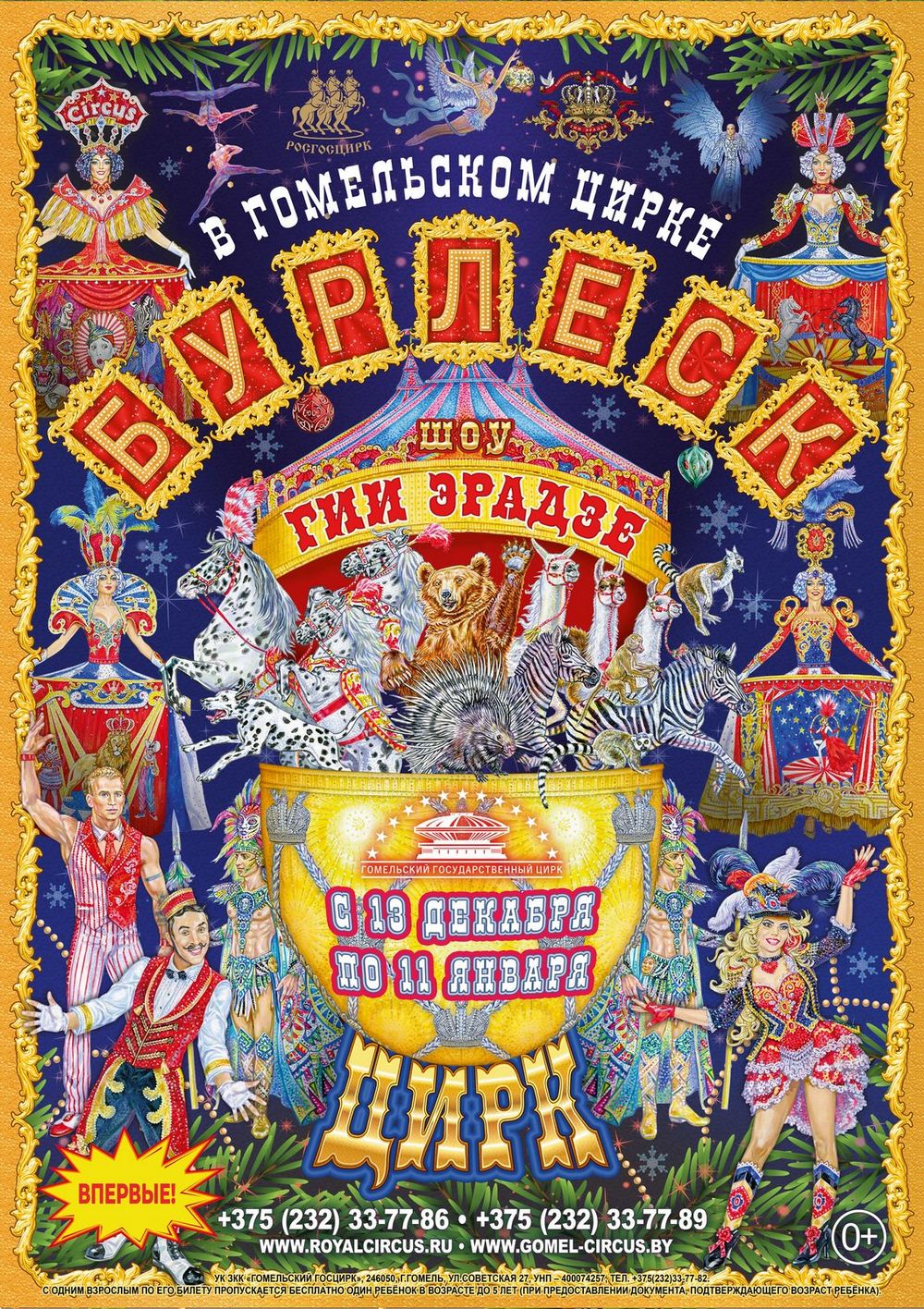 С 13 декабря 2025 года по 11 января 2026 года Заслуженный артист РФ Гия Эрадзе совместно с компанией «Росгосцирк» представит на манеже гомельского цирка титулованное шоу, не имеющее аналогов во всем мире — яркий и масштабный «Бурлеск».