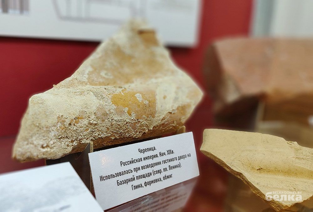 Под стеклом — фрагменты самых разных кирпичных построек Гомельщины. Например, черепица с крыши гостиного двора, построенного в начале 19 века по проекту англичанина Джона Кларка. Или кирпич со знаменитой пожарной каланчи, которая простояла с 1910-х до 1965 года на пересечении современной площади Ленина с одноимённым проспектом.