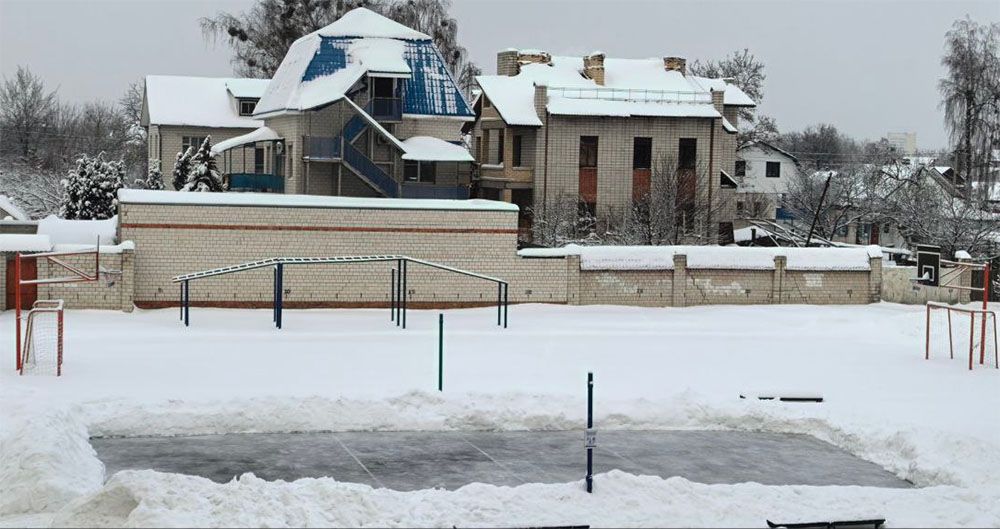Льдом покрывают волейбольную площадку на школьном дворе. Каждые выходные там проходят массовые катания для учащихся и их семей.