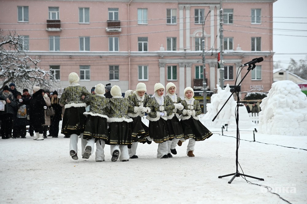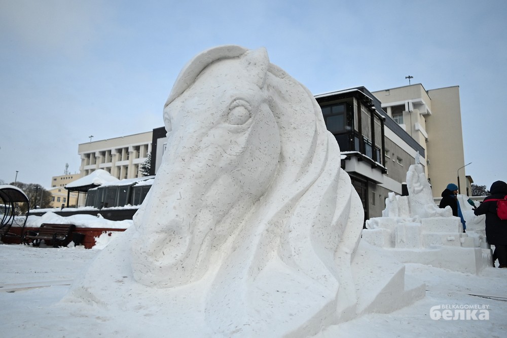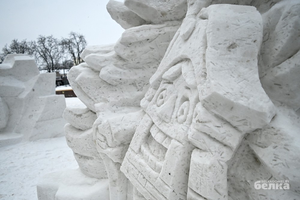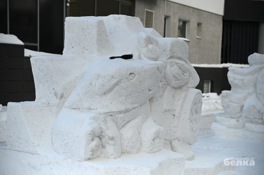 Среди участников – известные и начинающие белорусские художники-скульпторы. Они превратили глыбы снега в знакомые с детства образы Щелкунчика, медвежонка Умки, Алёнки, мудрой совы, девочки, тянущейся за звездой. Из снежной массы также построили многоэтажку для лесных зверей и изобразили белорусскую женщину, в чью честь объявлен 2026 год.