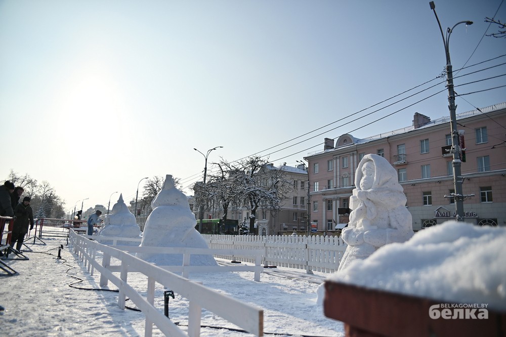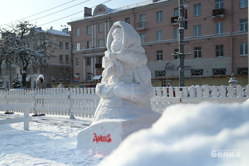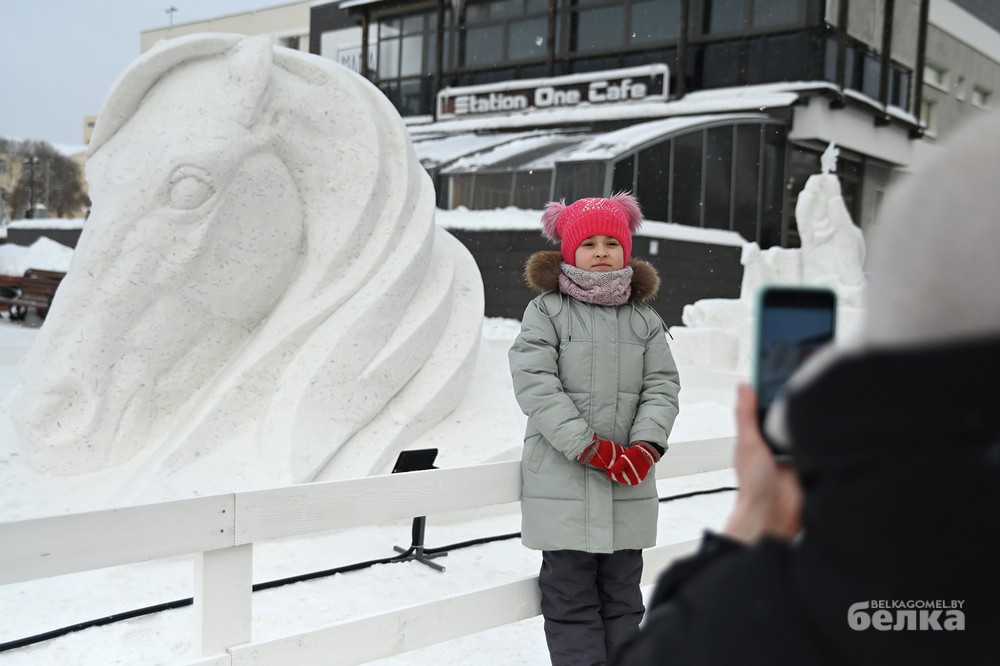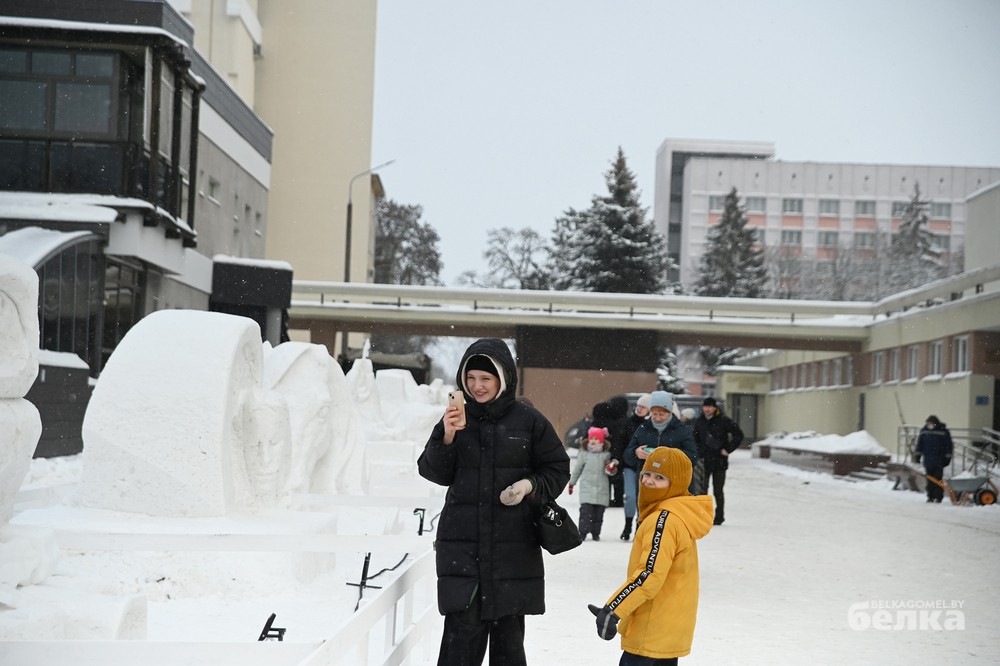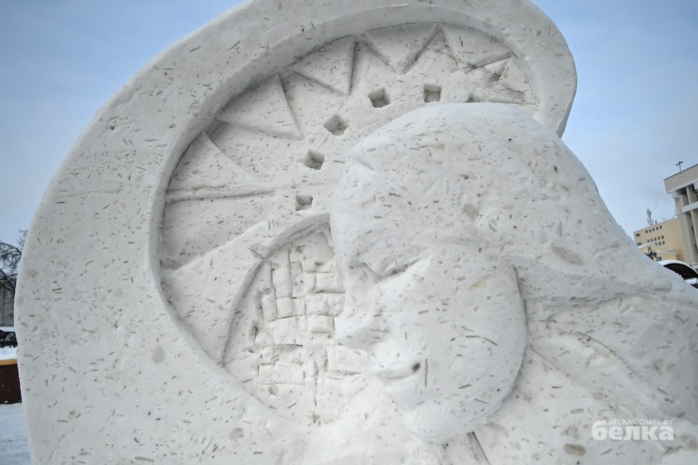 Среди участников – известные и начинающие белорусские художники-скульпторы. Они превратили глыбы снега в знакомые с детства образы Щелкунчика, медвежонка Умки, Алёнки, мудрой совы, девочки, тянущейся за звездой. Из снежной массы также построили многоэтажку для лесных зверей и изобразили белорусскую женщину, в чью честь объявлен 2026 год.