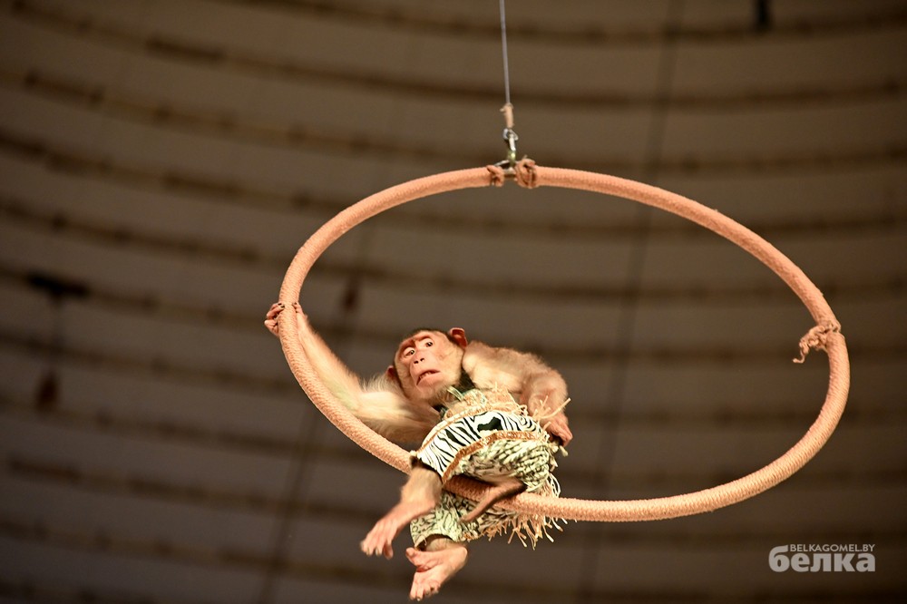 Здесь белые шпицы делают стойку на передних лапах, кошки катаются на самокате, а обезьяны-вольтижёры ходят на ходулях. К слову, приматы освоили этот сложный трюк за один год.