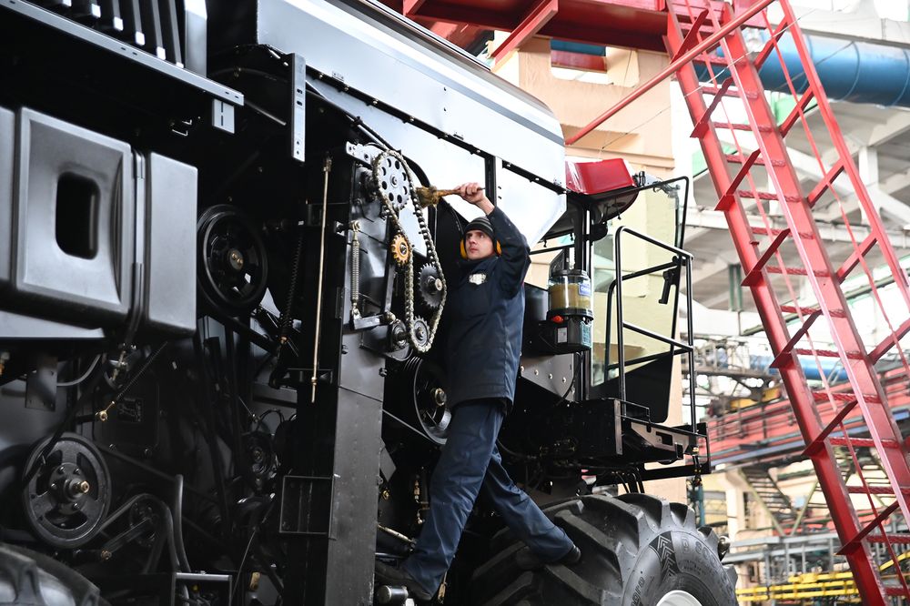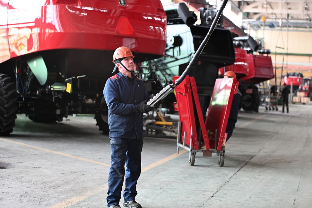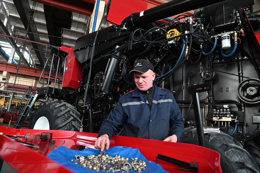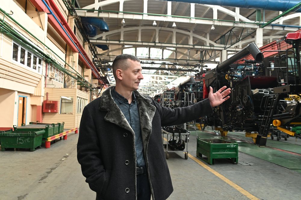 По словам Дмитрия Бобровничего, всего в цехе работают 350 человек, из них 200 слесарей механосборочных работ. Пока комбайн идёт по конвейеру, в его сборке принимают участие от 100 до 120 человек.