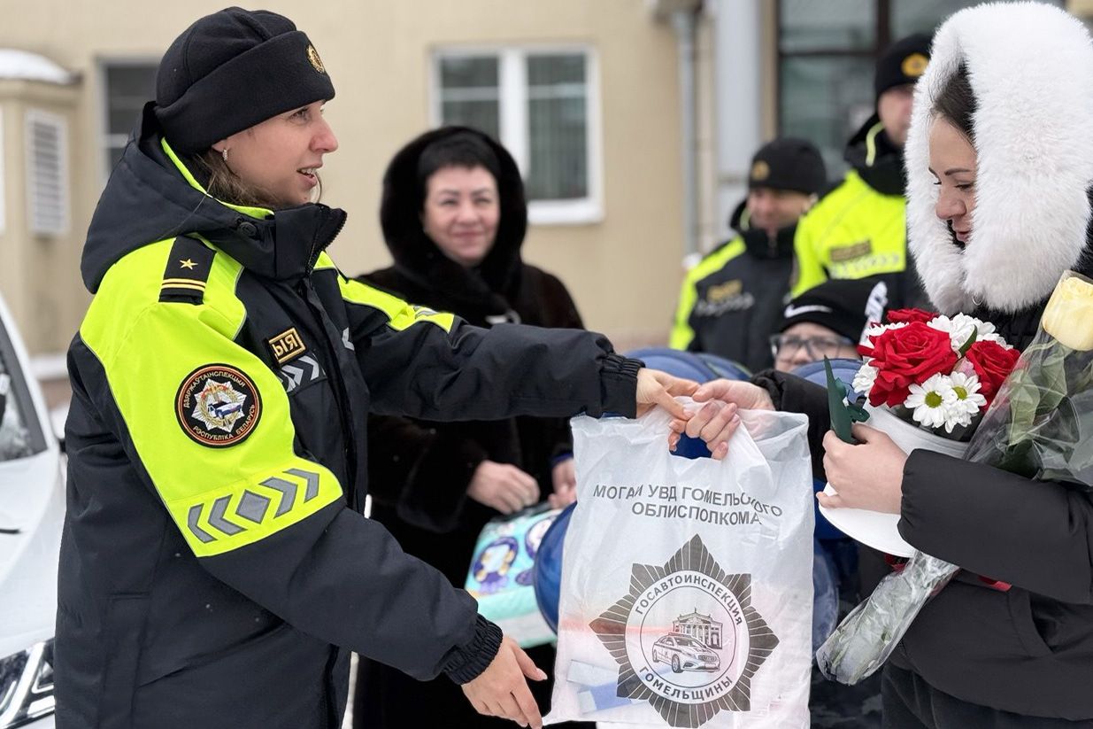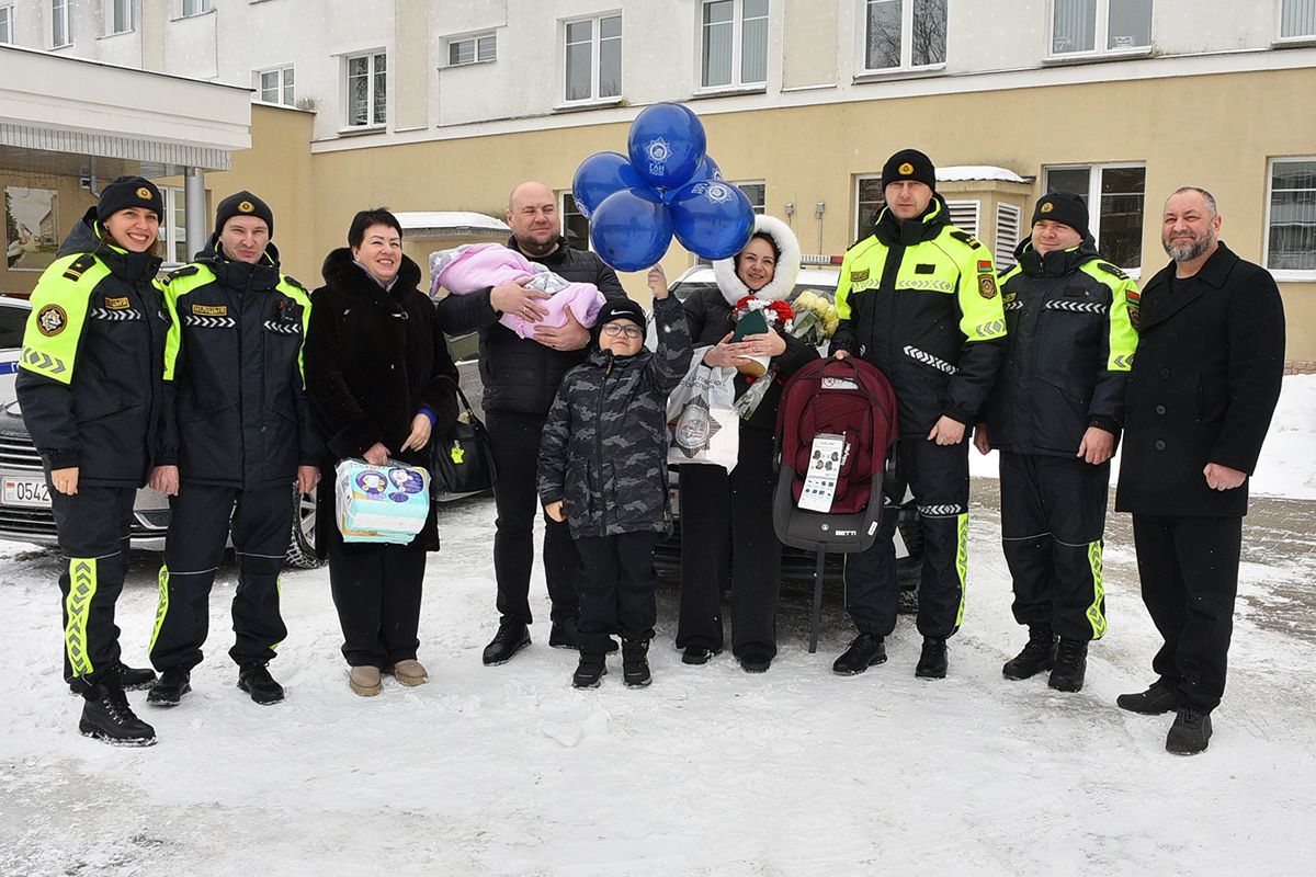 Спустя неделю представители Госавтоинспекции встречали счастливую семью уже во время выписки. Для малышки они приготовили практичные подарки – детское автомобильное кресло и памперсы.