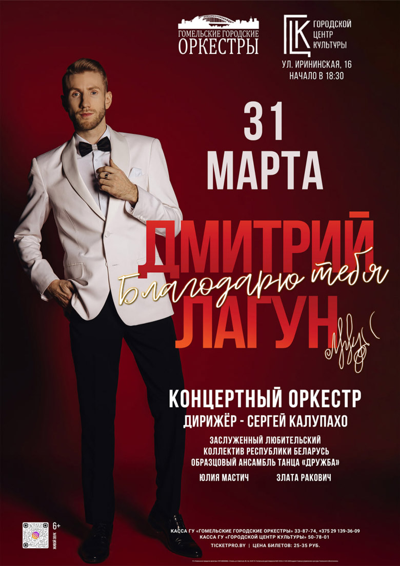 Обладатель глубокого проникновенного баритона Дмитрий Лагун приглашает гомельчан и гостей города на концертную программу «Благодарю тебя». Вечер, наполненный красивыми мелодиями, искренними эмоциями и живым звуком, состоится на сцене ГЦК (ул. Ирининская, 16).