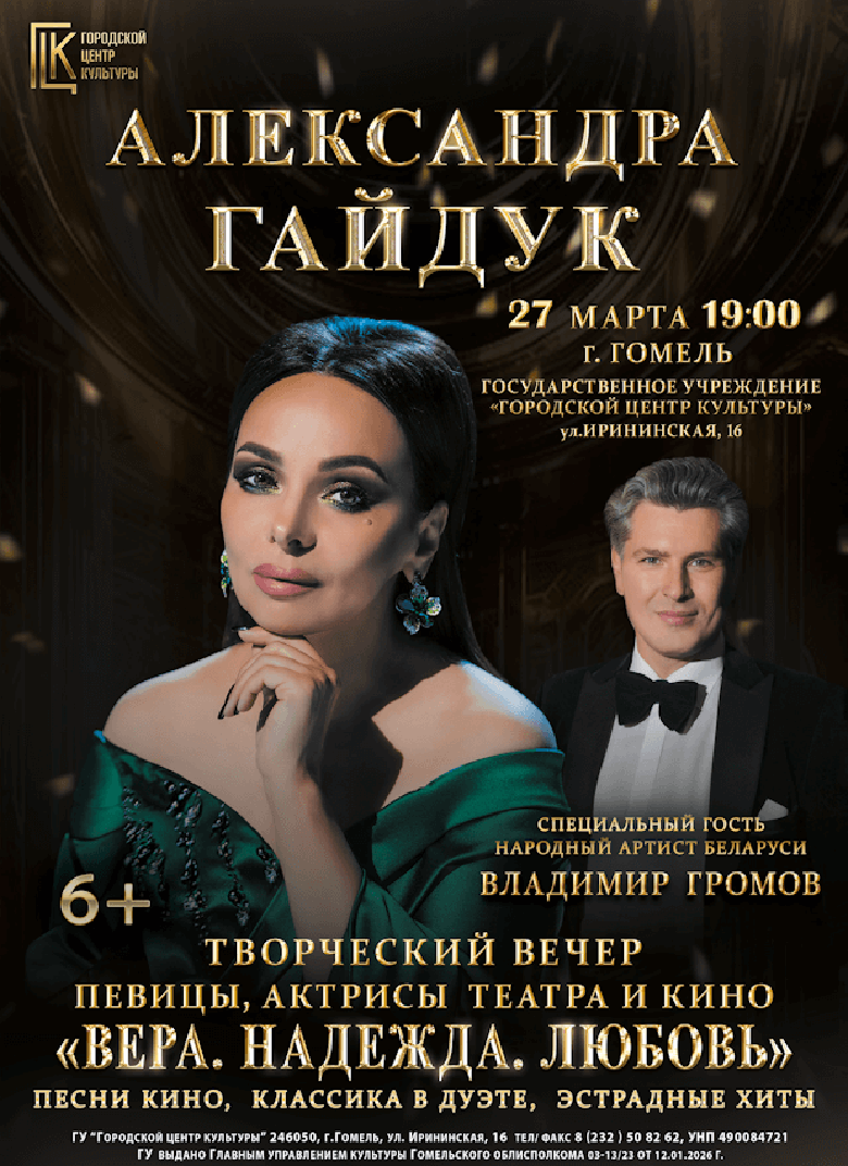 В ГЦК (ул. Ирининская, 16) в этот же вечер пройдёт концерт обладательницы медали Франциска Скорины, актрисы театра и кино, популярной артистки эстрады и телеведущей Александры Гайдук. Специальный гость программы — народный артист Беларуси Владимир Громов.