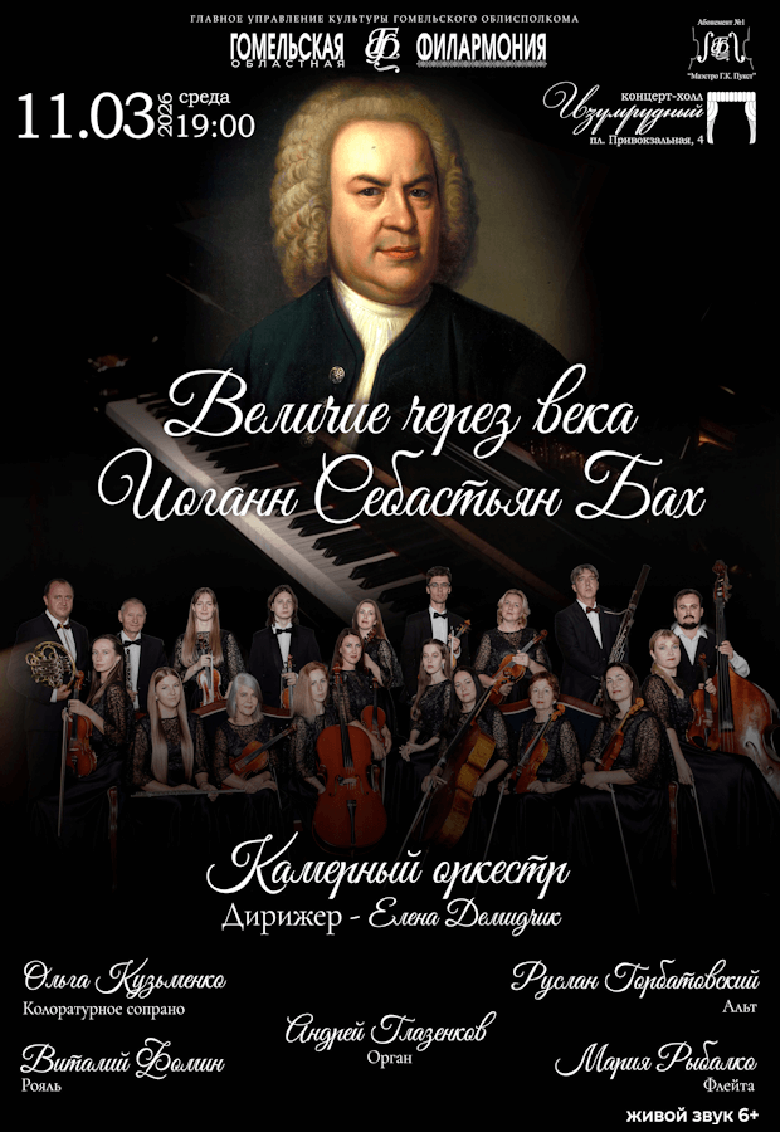 Так называется концерт, посвящённый музыке Иоганна Баха. Солисты Гомельской областной филармонии в сопровождении камерного оркестра под управлением Елены Демидчик создадут портрет композитора, чьё искусство не подвластно времени, в изумрудном концерт-холле (пл. Привокзальная, 4).