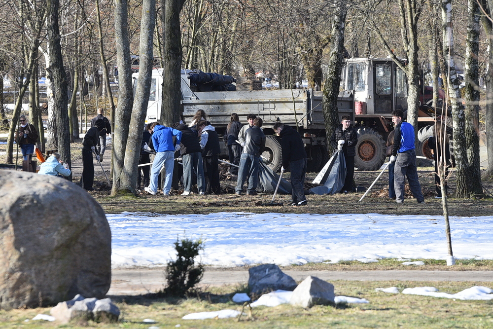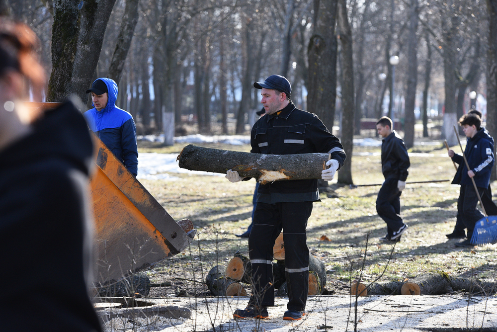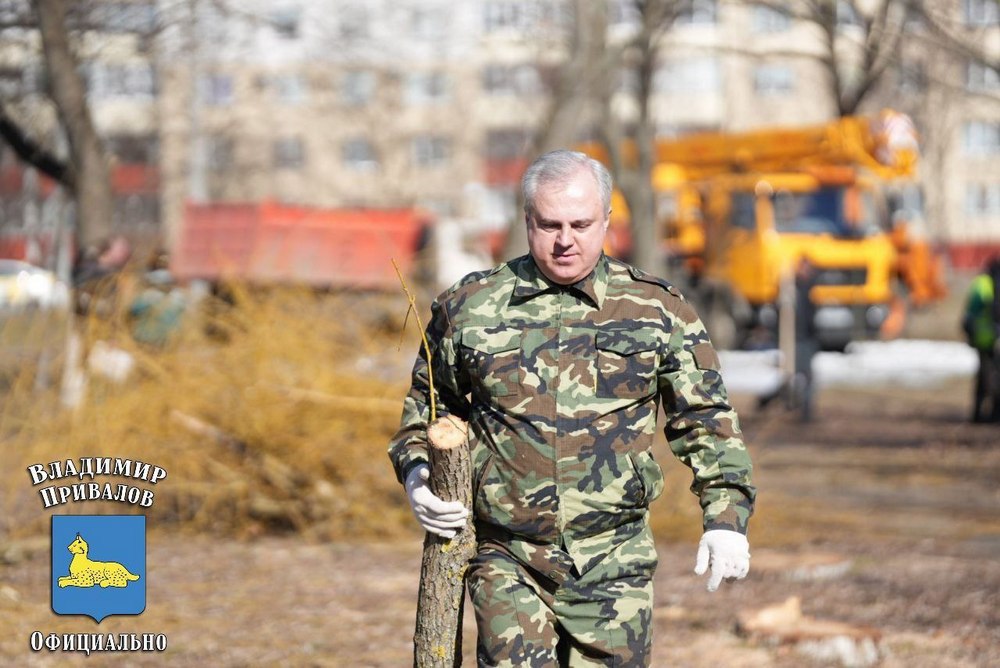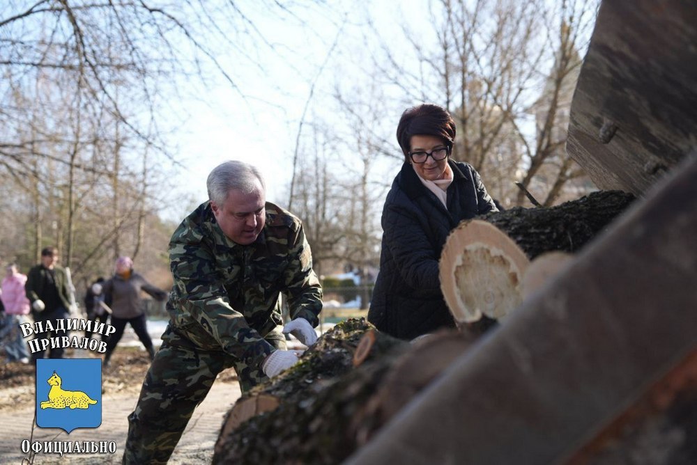 На субботнике в парке Фестивальном трудились председатель горисполкома Владимир Привалов и председатель горсовета депутатов Елена Алексина. Ещё накануне коммунальные службы распилили аварийные деревья, и представители власти помогали складывать поленья в грузовики.