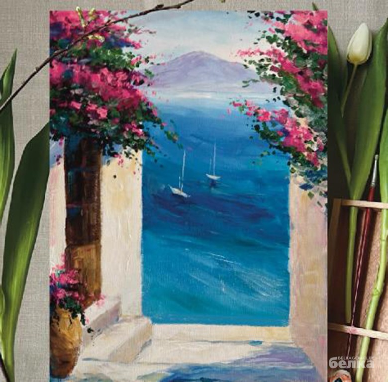 Прочувствуйте атмосферу: синее море, белые парусники и светлые стены из известняка, окаймлённые ярко-розовыми цветами. Окно в солнечную Грецию будут рисовать в арт-студии «Черника». Записывайтесь в директе студии.