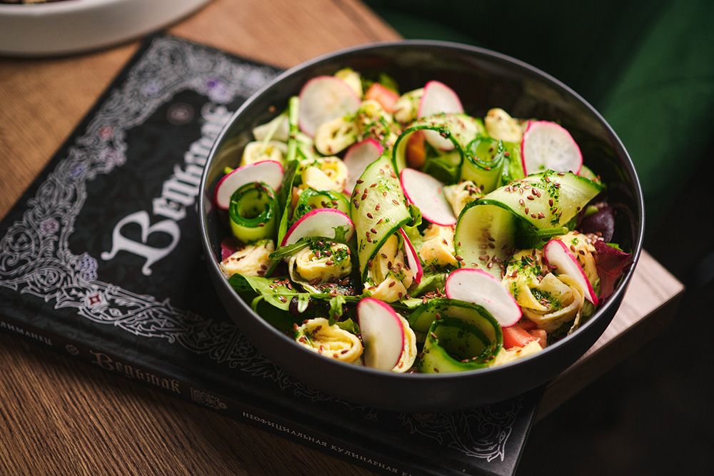 - Зеленый салат с сырным омлетом из трактира «Под задумчивым Драконом»;