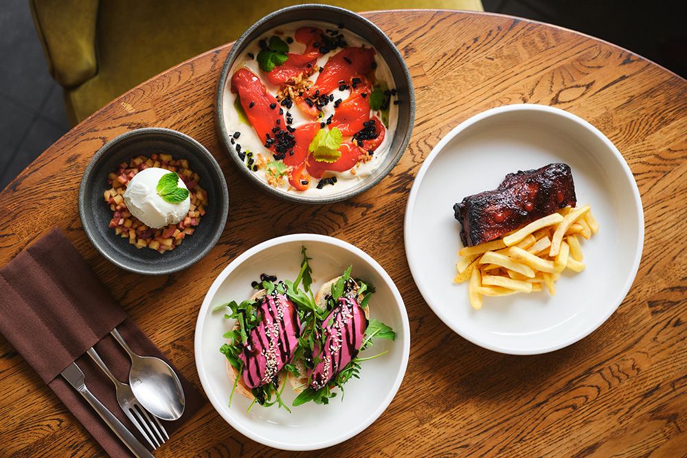 - Татаки из говяжьей вырезки с соусом «Биск», зеленым салатом и хрустящим картофелем;