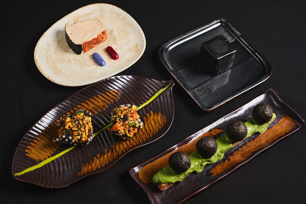 - Паштет в виде хлеба с чёрной бриошью, подаётся с красной и синей таблеткой – соусом остро-ягодным и грибным;