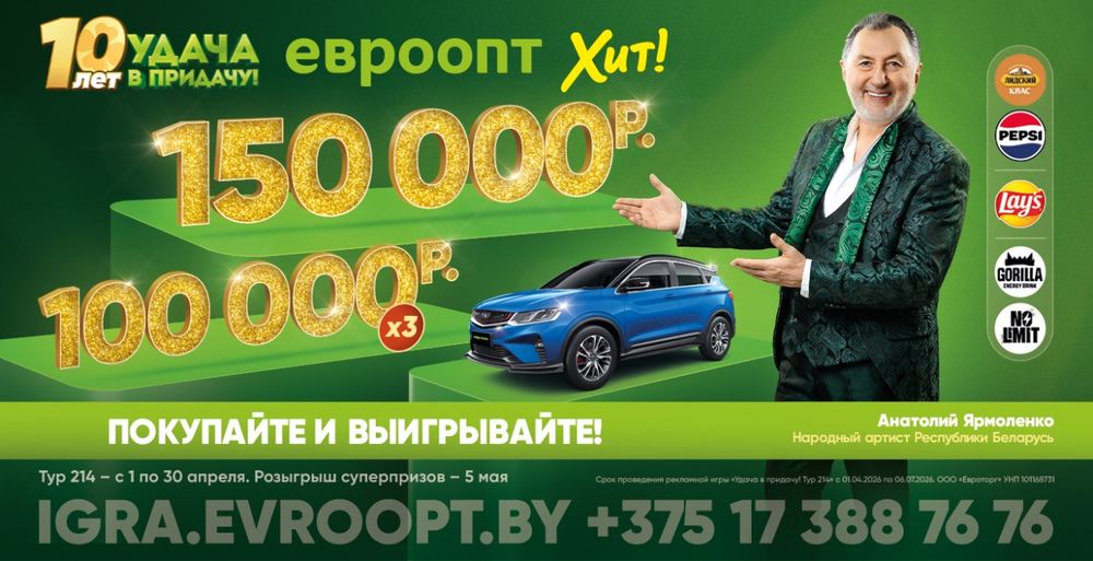Срок проведения рекламной игры «Удача в придачу! Тур 214»: с 01.04.2026 по 06.07.2026, включая сроки выдачи призов и публикации результатов. Телефон горячей линии: + 375 (17) 388-76-76. Подробности: igra.evroopt.by
