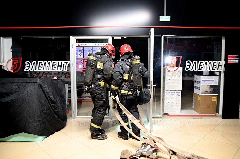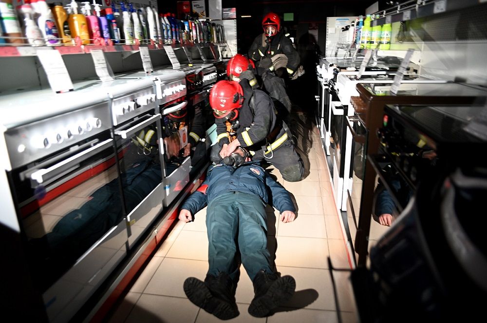 По сценарию, после эвакуации администрация магазина не досчиталась четырех человек. На их поиски выдвинулся отряд с аппаратами сжатого воздуха. Условных пострадавших обнаружили в торговом зале.